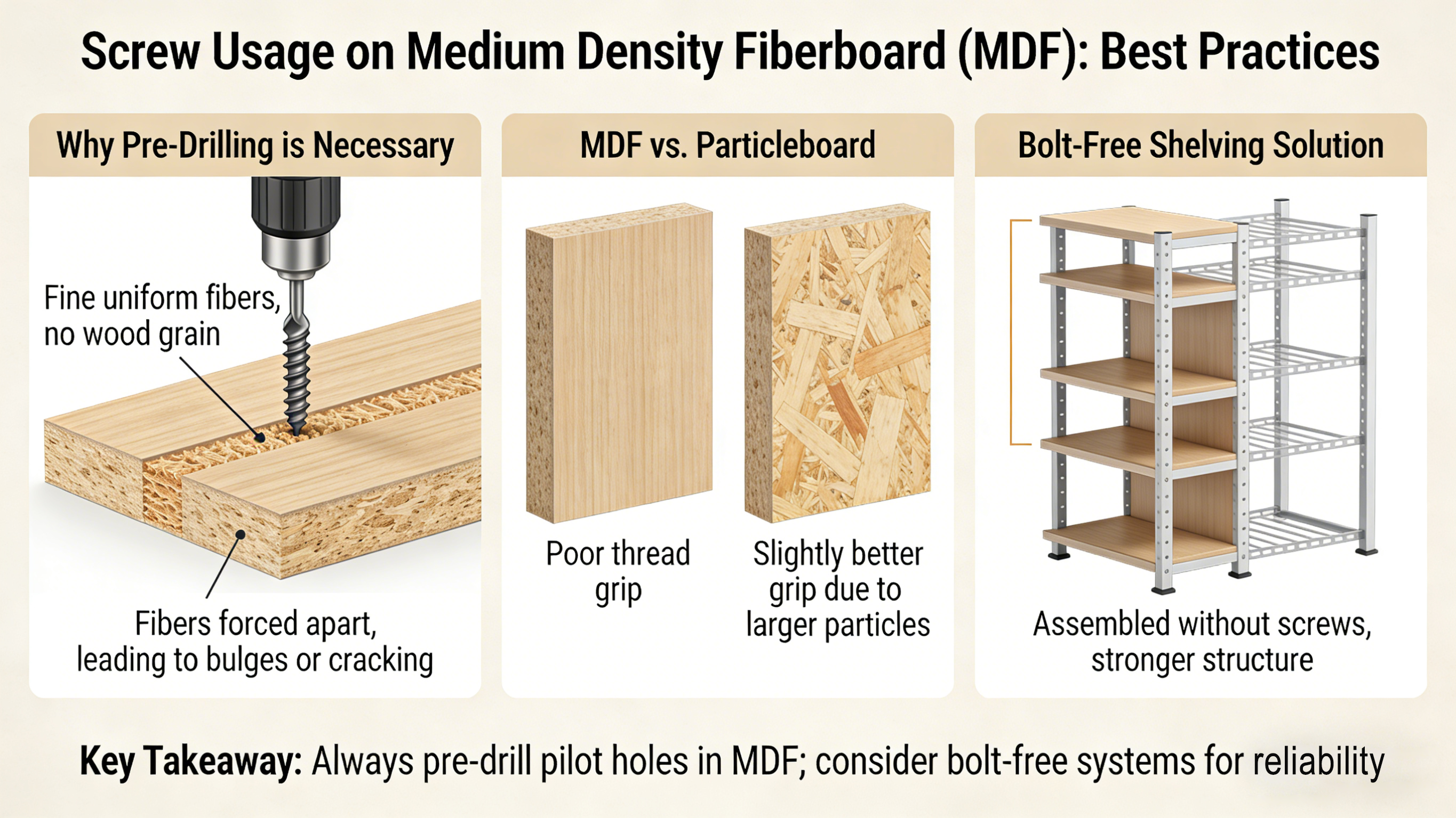 This is a very practical question that highlights a key difference. The fine, uniform fiber structure of MDF doesn’t have the grain and larger particles that give screws a strong bite. When you drive a screw into MDF without a pilot hole, you’re forcing the fibers apart, which often results in a visible bulge or a complete split. Even with a pilot hole, the holding power is limited. This is why furniture made from MDF often uses special hardware like cam-lock fasteners. Particle board, with its larger chips, offers a slightly better, though not perfect, grip for standard wood screws. However, the best solution is to avoid relying on screws at all. Our boltless shelving systems are designed so that no screws are needed for assembly, completely eliminating this problem and creating a stronger, more reliable structure.