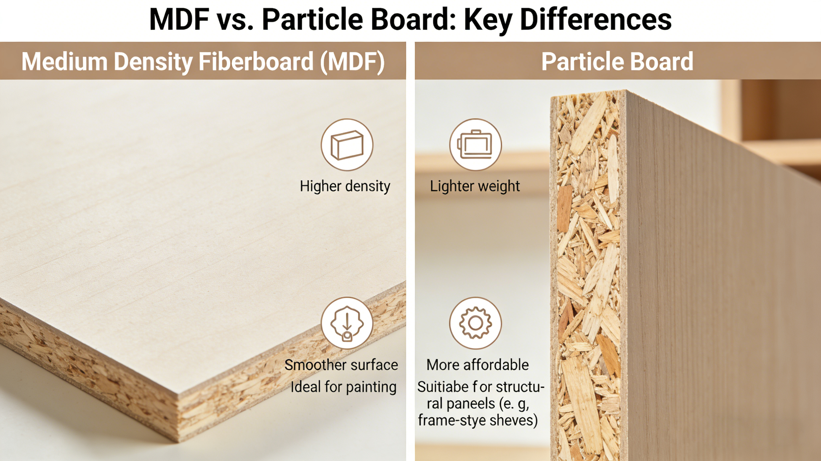 Neither is “better”—they are different. MDF is denser, smoother, and better for painting. Particle board is lighter, more affordable, and excels as a structural shelving deck within a frame.